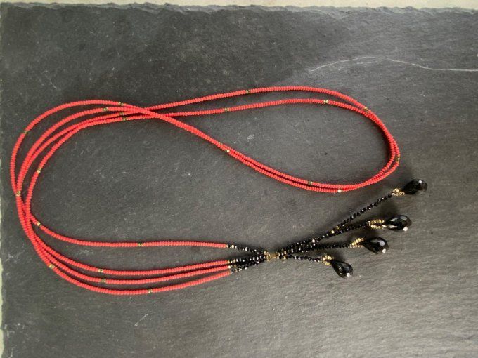 Collier sautoir façonné de minuscules perles de corail, d'onyx noir et pyrites. Création originale. Artisanat d'Afghanistan Longueur : 47 cm Poids : 15g