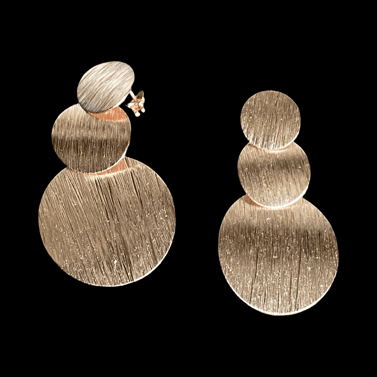 Boucles d'oreilles composées de 3 cercles en argent brossé plaqué or rose, reliées par de petits anneaux qui leurs donnent un joli mouvement.