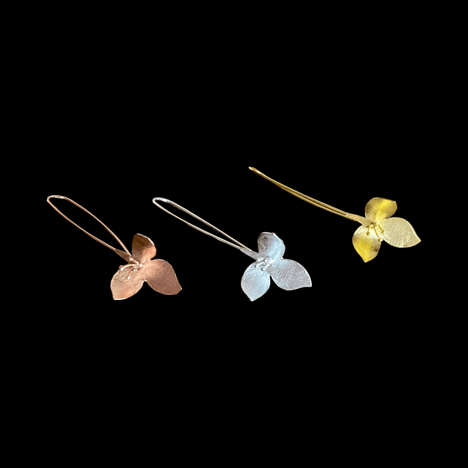 Boucles d'oreilles en argent plaqué or. Sur une longue tige sont soudés 3 pétales représentant la fleur de lotus.